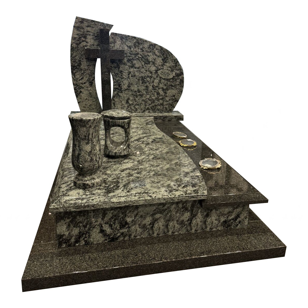 Monument en granit Gris Zéphyr G603 pour inhumation avec semelle, plinthe et vases