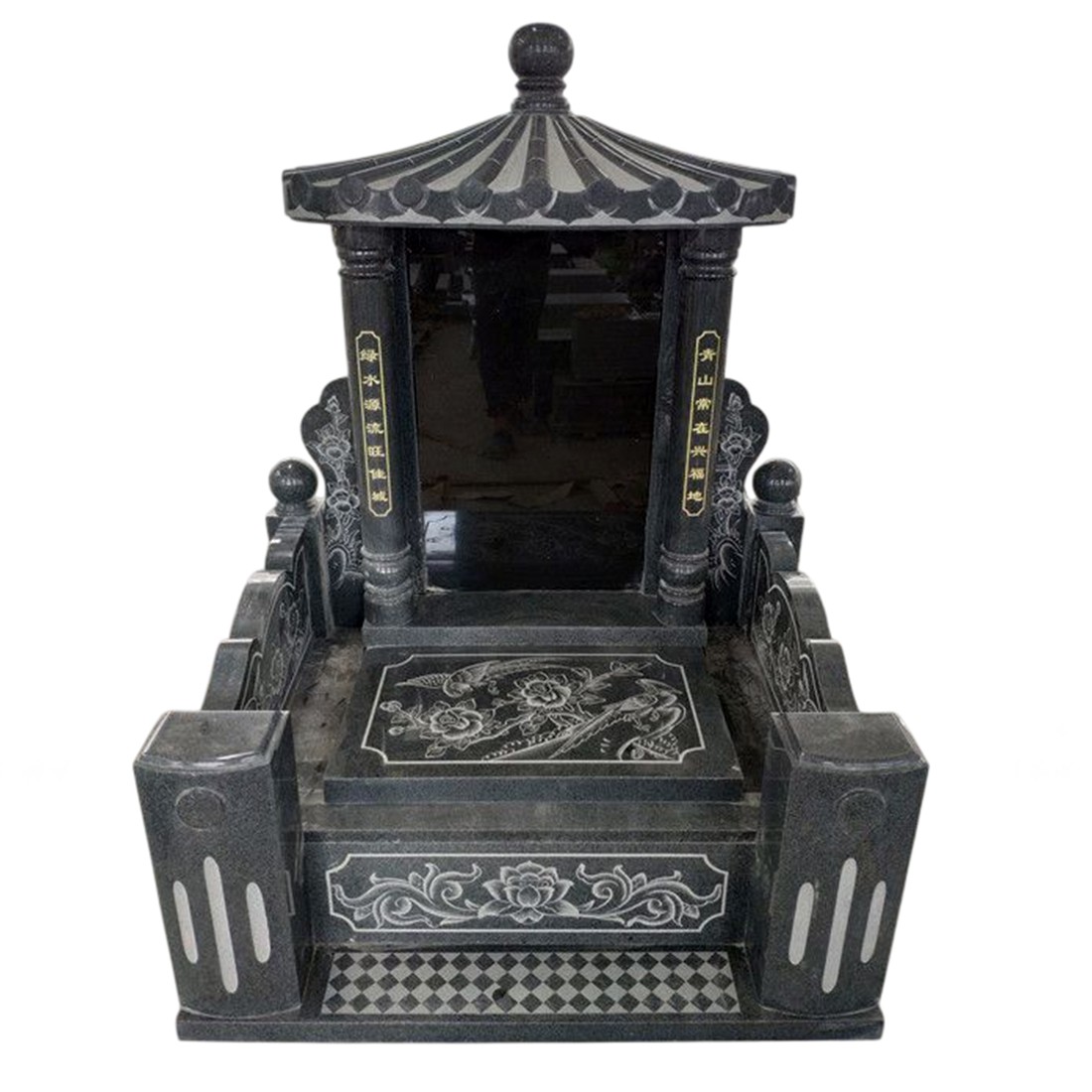 Fabrication en Chine Pierre tombale style chapelle asiatique en granit G654 avec toit et piliers gravés